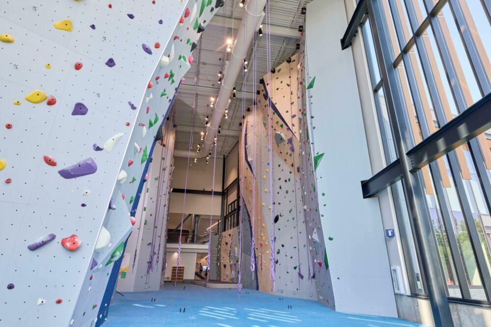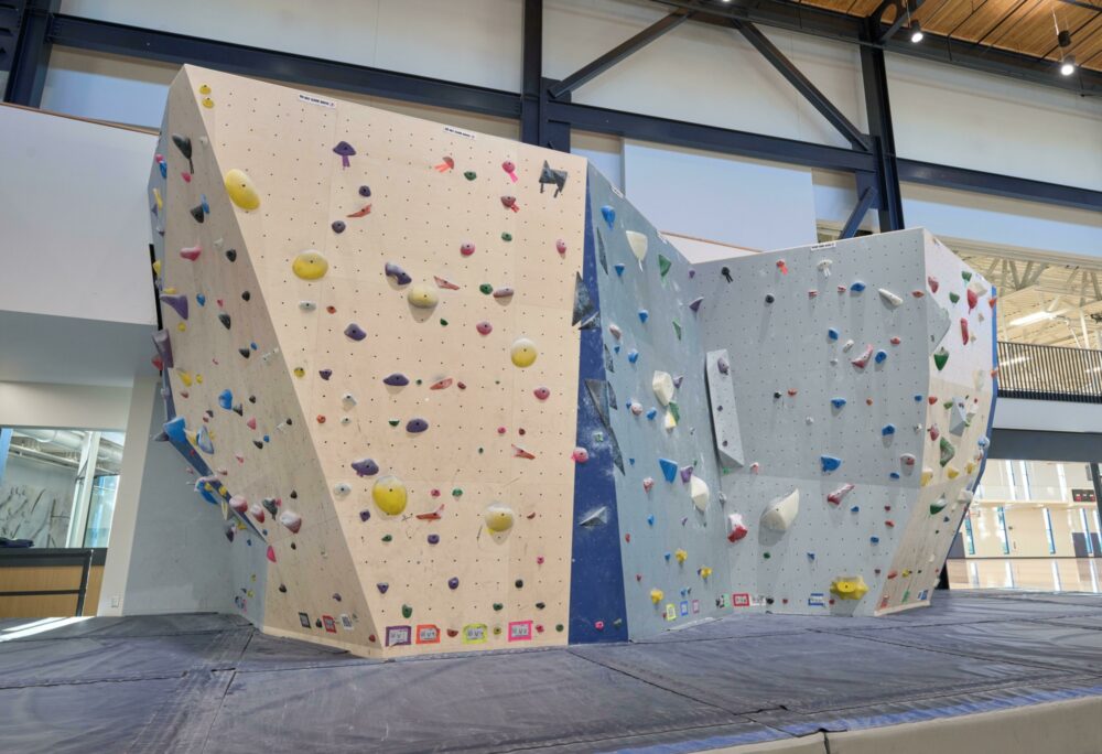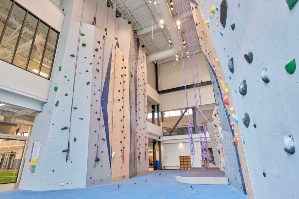Following a roof collapse caused by excessive snow loading, the university lost its existing climbing wall. EP Climbing provided a temporary bouldering wall to maintain climbing access during the transition, then delivered a new system as part of the 15 000 sqm (162,000 sq ft) wellness center, funded in part through student-approved fees.