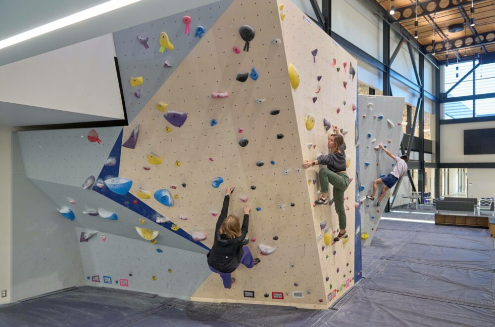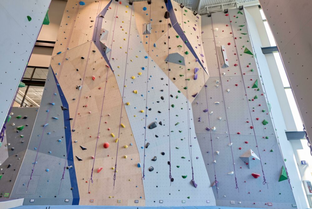 Climbing is integrated into Campus Recreation and Outdoor Recreation programming, supporting instruction, clinics, events, and open use within a facility serving approximately 2,100 users per day.