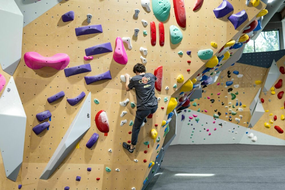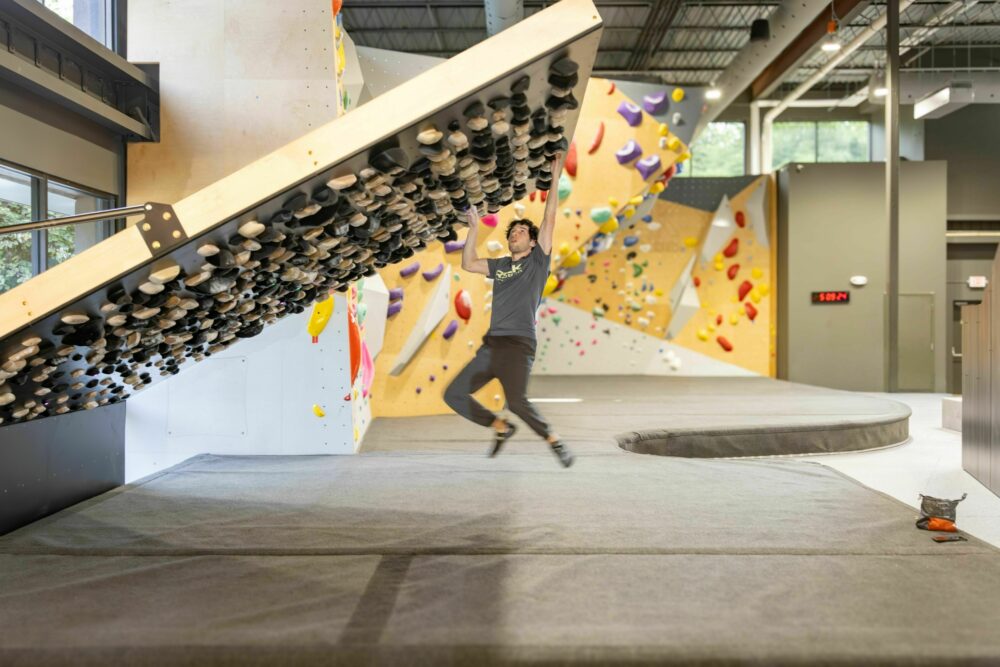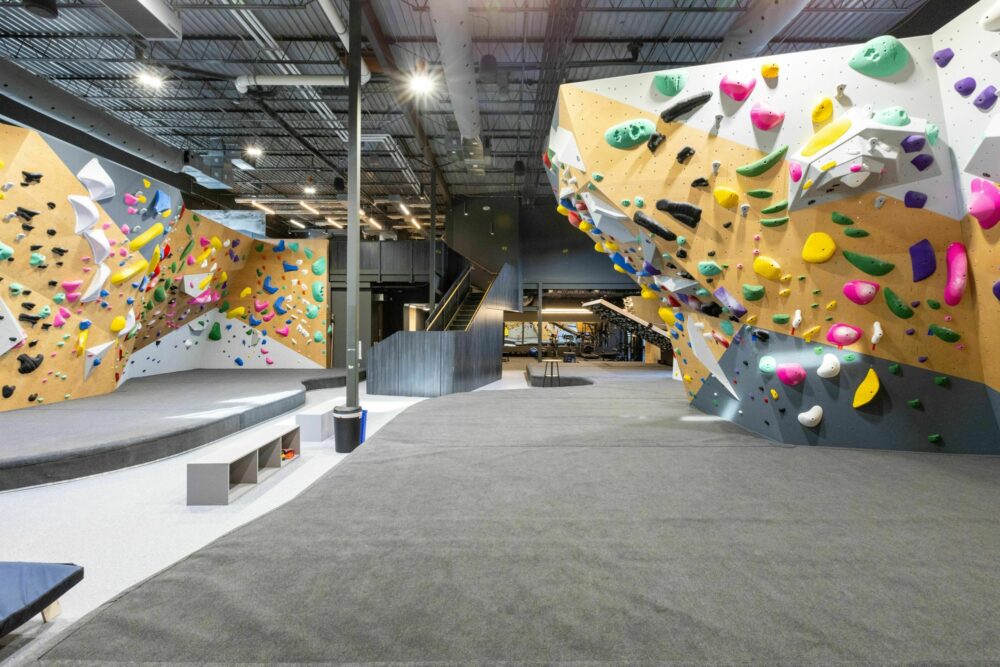 Beyond climbing, the gym offers a multipurpose room designed for events and community gatherings, along with a comfortable lounge area, locker rooms with showers, and a retail space. An advanced air filtration system helps manage chalk and maintain a high level of indoor air quality, ensuring a comfortable environment for climbers and visitors alike.
